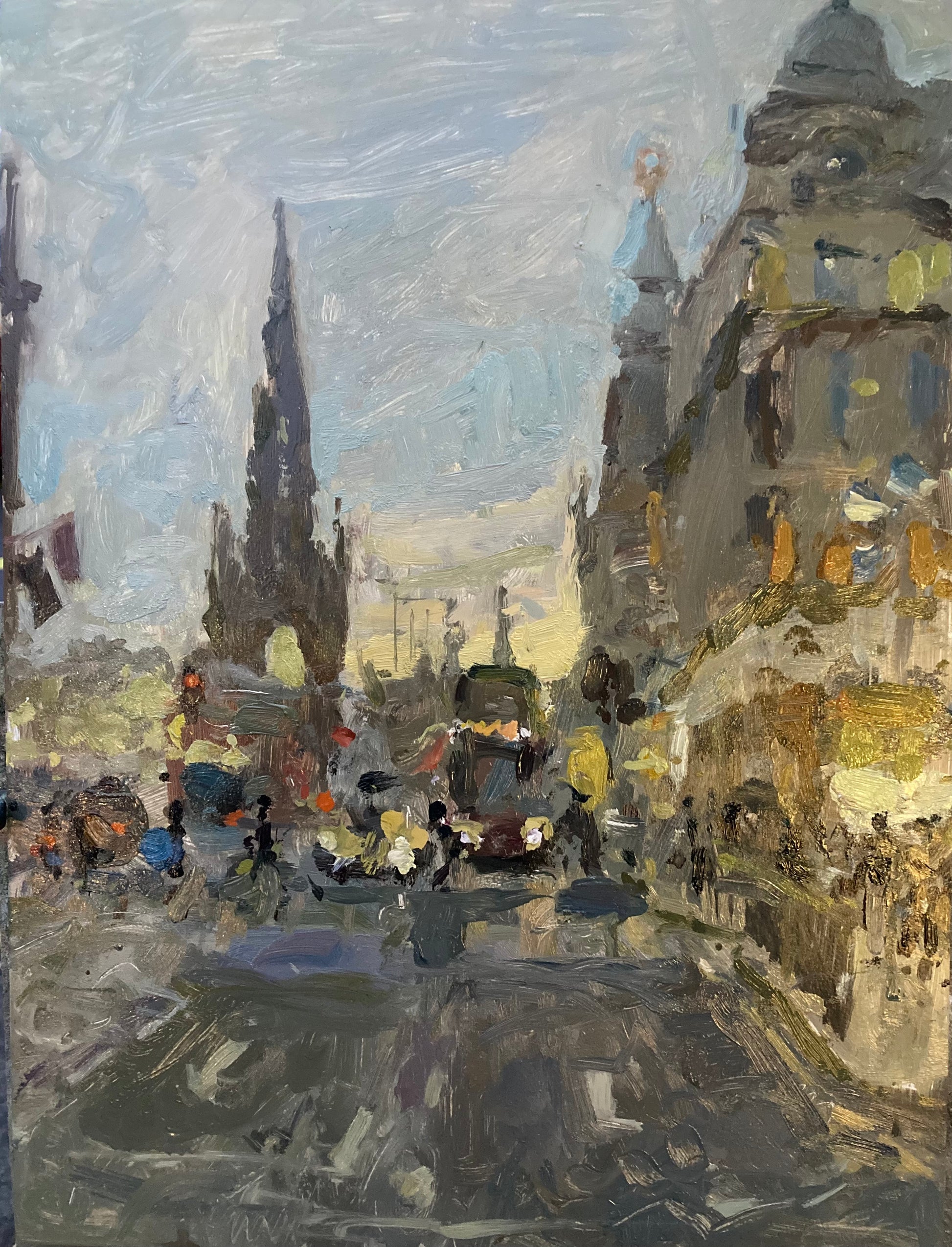 Painted as the sun was going down on Princes Street Edinburgh. You can see the Scott Monument, and the glow from the hotel windows. Painted alongside Ian Layton on a Northernboys trip to Edinburgh at Christmas time