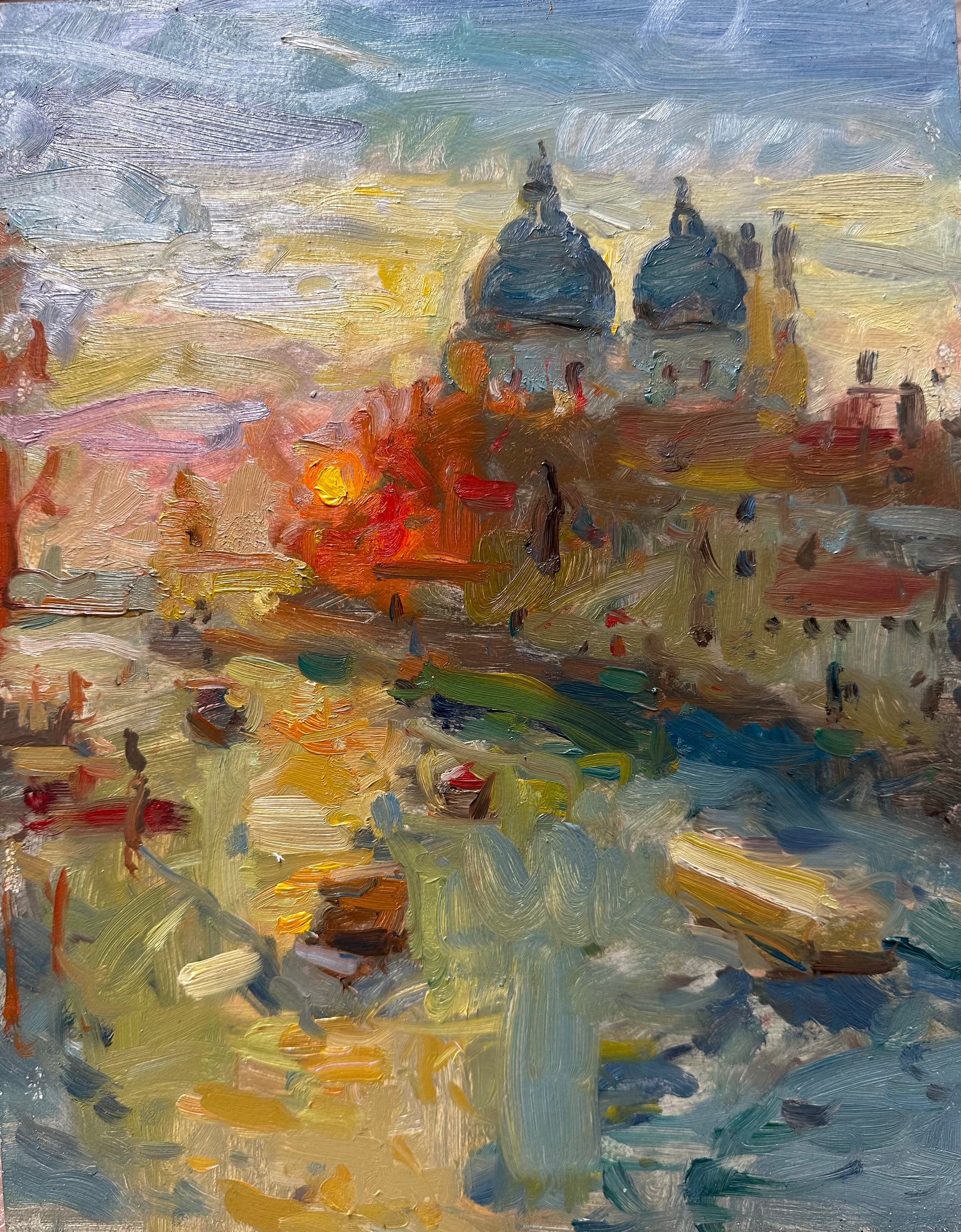 Sunrise this morning from the Accademia Bridge. Always hard knowing how to handle a scene like this other than paint fast, throw in plenty of colour and panic